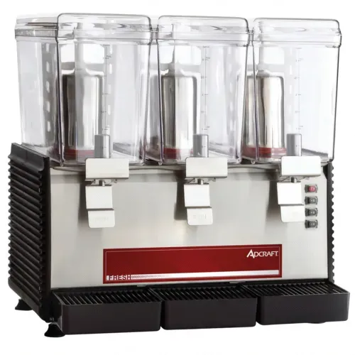 Adcraft Refrigerated Drink Dispenser, (3) 3 gallon clear polycarbonate bowls, continuous circulating rotary system, on/off switch, removable drip tray, silver/black finish, of stainless steel, plastic and copper construction, 120v/60/1-ph, 880 watts, 7.4 amps, NEMA 5-15P, CE, cETLus, ETL-Sanitation(ADC3BRDD)Q & A