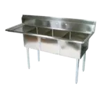 Square Corner Scullery Sink, 3-compartments, 12"W x 21"D front-to-back x 14" deep sink compartments, 8"H backsplash, 1-1/2 IPS waste drain baskets included, 16 gauge 430 stainless steel, galvanized legs with plastic bullet feet, 24-1/2" F/B x 36" L/R (overall)