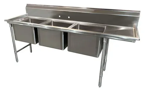 Regaline Sink, 3-compartment, with right-hand drainboard, 24" front-to-back x 18"W sink compartments, 12" deep, with 8"H backsplash, stainless steel open frame base, side crossrails, 18" drainboard, 1" adjustable bullet feet, 18 gauge 304 series stainless steel, overall 31" F/B x 82 3/8" L/R, NSFQ & A