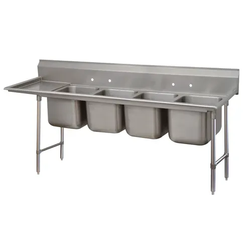 With four 12" deep compartments and an 18" drainboard, this 111" wide, 31" deep commercial sink from Advance Tabco is an excellent dishwashing station that can improve the way your kitchen runs. Each compartment measures 20" wide and 28" front to back, which provides you with lots of room to perform individual cleaning tasks. The 8" high backsplash ensures the wall behind the unit stays dry to keep your work area clean and safe. This four-compartment sink is sturdy, sleek, and low-maintenance, thanks to the stain and rust-proof 304 stainless steel with 16-gauge thickness. The base is also made of stainless steel and has an open-frame design fitted with side cross rails and 1" adjustable bullet feet.