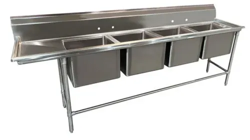 This 129" wide, 27" deep commercial sink from Advance Tabco has a set of four 14" deep compartments flanked with 36" drainboards to create the ultimate dishwashing station for your operation. Each compartment is 20" wide and 20" front to back, allowing you to accomplish every step of the ware washing process in an easy and sanitary way. This four-compartment sink has an outstandingly sturdy, rust- and stain-resistant 304 stainless steel construction with a 14-gauge thickness to deliver dependable performance for many years. There is an 11" high backsplash that ensures the wall doesn't get wet during dishwashing, making your work area effortlessly sanitary. This commercial sink has stainless steel legs with 1" adjustable bullet feet plus welded side cross rails and adjustable front and back cross rails.