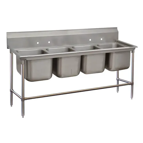 Regaline Sink, 4-compartment, 24" front-to-back x 18" wide sink compartments, 14" deep, with 11" high splash, stainless steel legs with adjustable left-to-right and front cross rails, 1" adjustable bullet feet, 14 gauge 304 stainless steel, overall 32" F/B x 91" L/R, NSF (requires 2 faucets)Q & A
