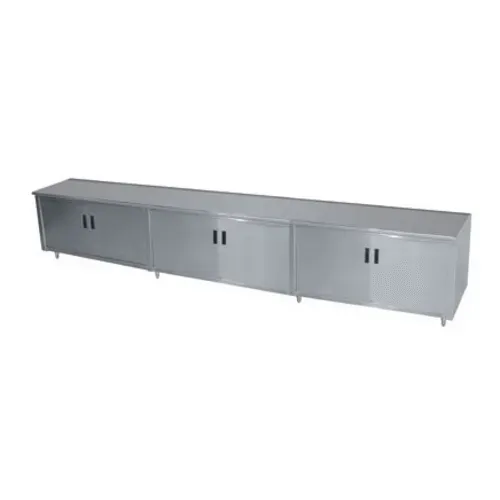 Work Table, 144"W x 30"D, cabinet base with mid-shelf & hinged doors, 14 gauge 304 stainless steel top, stainless steel legs with adjustable hex feet, NSFQ & A