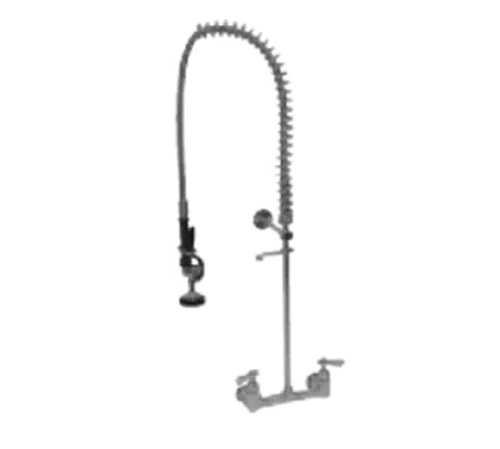 T&S Heavy Duty Pre-Rinse Faucet, 8" OC, splash mounted, includes: spray valve & hose, riser, wall bracket, overhead spring, lead freeQ & A