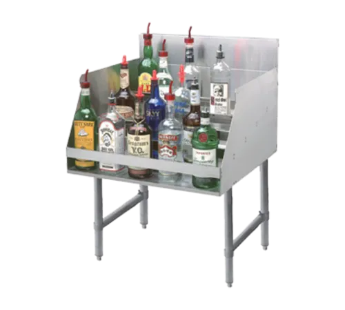 Liquor Bottle Display Unit, (5) steps, 12"W x 26"D x 33"H, approximately (15) bottle capacity, 4" backsplash, stainless steel construction, galvanized legs with adjustable plastic bullet feet, NSFQ & A