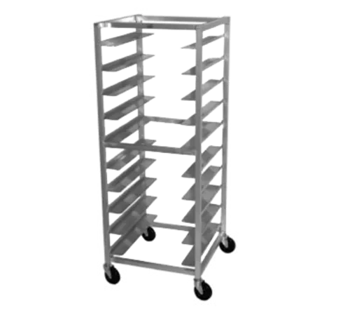 Oval Tray Rack, mobile, full height, 26"W x 28"D x 69-1/4"H, open sides, capacity (10) trays, 4" wide angle slides on 6" centers, front & rear loading, all-welded aluminum construction, 5" casters, NSFQ & A