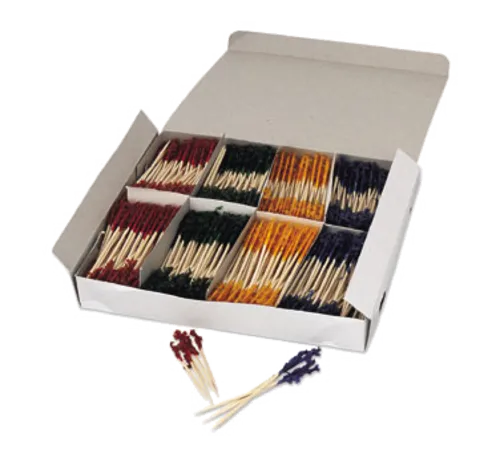 Toothpick Frills, 4-1/4"L, round, cellophane frill ends, wooden, assorted colors (1000 per box/10,000 per shipping case) (Sold in case lot only)Q & A
