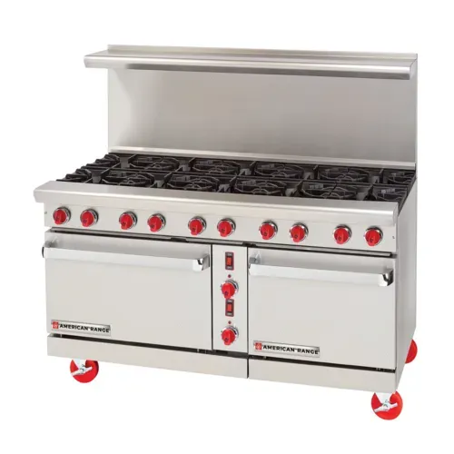 Green Flame Range, gas, 60", (10) 22,000 BTU open burners, (1) 26-1/2" standard oven on left, (1) 20" standard space saver oven on right, (2) racks each oven, pilotless burner, ovens ignition systems, stainless steel front, sides, 20" back riser and shelf standard, option for 6" stub back, 6" adjustable chrome plated legs, 91.0kW, 312,000 BTU, cETLus, ETL-Sanitation, Made in USAQ & A