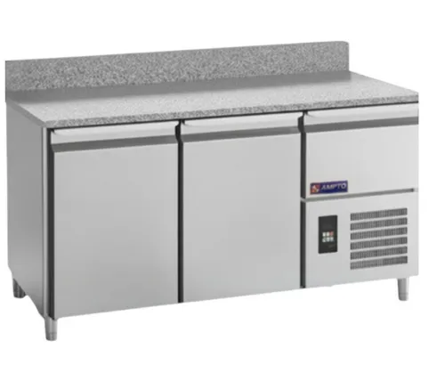 AMPTO® Granite Pizza Prep Table, refrigerated, two-section refrigerated and one-section neutral over compressor, 12.0 cu. ft. capacity, (2) self-closing doors, (1) stainless steel wire shelve per section with universal stainless steel tray slides included, digital controller, 30' deep Sardinian granite work Surface with rear risers 6-1/3” H, side mounted, slide-out self-contained refrigeration, 300 series stainless steel exterior & interior, R290 refrigerant, 110V/60hz, cETLus, ETL-SanitationQ & A