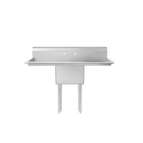 One Compartment Sink, 24" x 24" x 14" bowl, single compartment, 72"W x 29-1/2"D x 43-3/4"H exterior dimensions, both 24" drain boards, 22-1/2" leg size, stainless steel construction, stainless steel legs, 3.5" drain basket included, 1" adjustable bullet feet, NSFQ & A