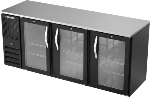 Refrigerated Food Rated Back Bar Storage Cabinet, three-section, 78"W x 26-3/8"D x 34"H, 21.686 cu. ft., (3) glass doors, snap-in door gasket, (6) epoxy coated steel shelves, (4) 1/2 barrel kegs, LED interior lighting with manual on/off switch, black exterior finish, 1" stainless steel top, stainless steel interior with radius corners is easy to keep clean & meets NSF Standard 7 for open container, left-mounted self-contained refrigeration, R290 Hydrocarbon refrigerant, 1/3 HP, 3.3 amps, 115v/60/1-ph, NEMA 5-15P, cULus, UL EPH ClassifiedQ & A