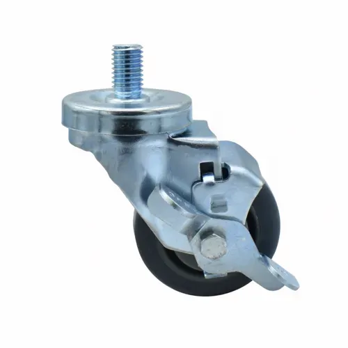 Rubber Wheel, 3" diameter, 5/8"-13 x 1" threaded stem, with top lock brake, non-marking, 250 lb. weight capacity, operational temp range -45° to 180°F, resistant to oil, grease, water &most solvents, double ball bearing, smooth and quiet, zinc plated, gray, NSFQ & A
