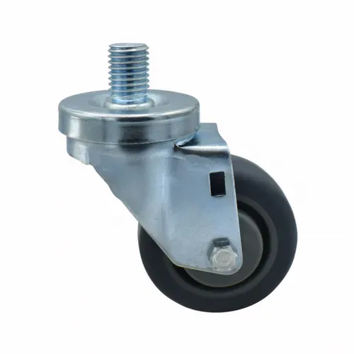 Rubber Wheel, 3" diameter, 3/4"-10 x 1" threaded stem, without brake, non-marking, 250 lb. weight capacity, operational temp range -45° to 180°F, resistant to oil, grease, water &most solvents, double ball bearing, smooth and quiet, zinc plated, gray, NSFQ & A