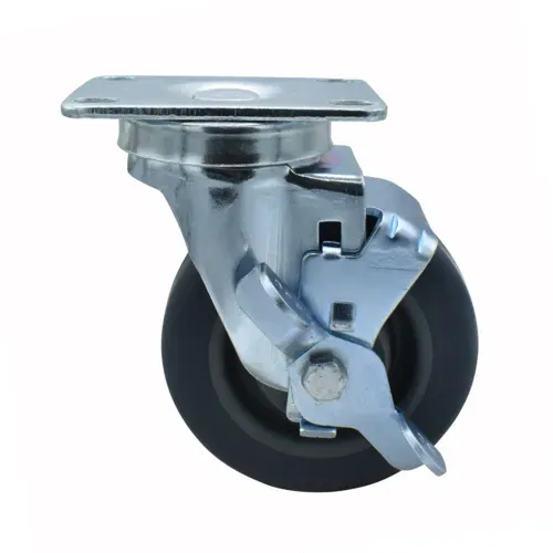 Rubber Wheel, 4" diameter, 2-3/8" x 3-5/8" top plate, with top lock brake, 1/2" king pin, non-marking, 250 lb. weight capacity, operational temp range -45° to 180°F, resistant to oil, grease, water &most solvents, double ball bearing, smooth and quiet, zinc plated, gray, NSFQ & A