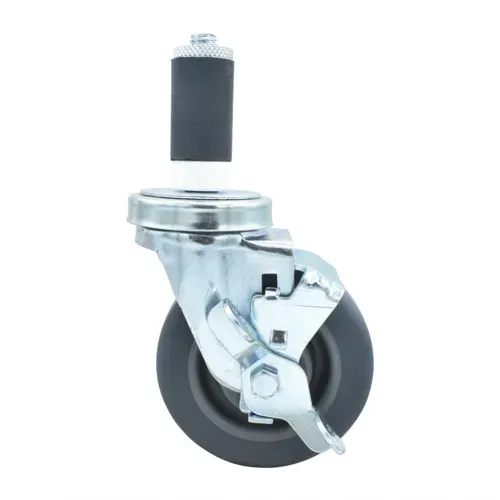 Swivel Caster, 1-1/4" expanding stem, 4" gray rubber wheel, top lock brake, 250 lb. capacity, fits 1-1/4"W OD tubing, resistant to oil, grease, water, most solvents, double ball bearing, operational temp range -45ºF to 180ºF, zinc plated steelQ & A