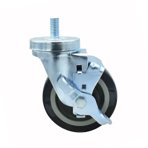 Polyurethane Wheel, 4" diameter, 1/2"-13 x 1" threaded stem, with top lock brake, 300 lb. weight capacity, operational temp range -45° to 180°F, resistant to acids & caustics, double ball bearing, zinc plated, , NSFQ & A