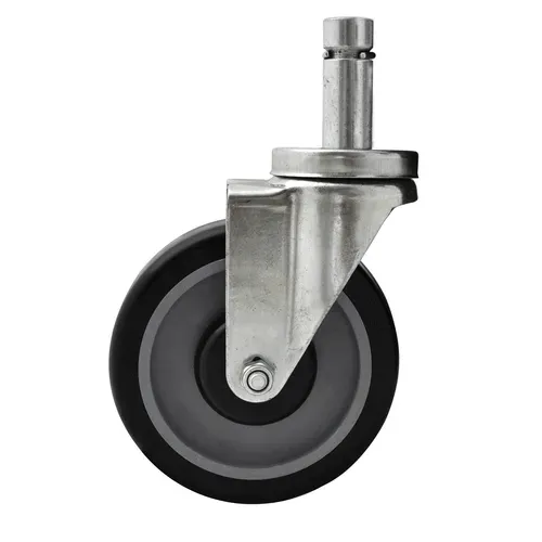 Caster, 5" diameter, pop-in stem, grip ring, top lock brake, medium duty, non-marking polyolefin tread, impact resistant, 300 lb. capacity, highly resistant to chemicals & solvents, fits 1" OD tubing, 1/2" king pin, double ball bearing, operational temp range -45° to 180° F, zinc plated, NSFQ & A