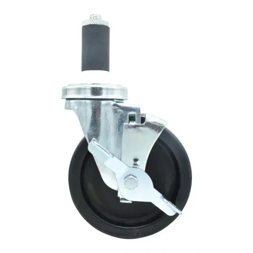 Swivel Caster, 1-1/4" expanding stem, 5" polyolefin wheel, top lock brake, 300 lb. capacity, fits 1-1/4"W OD tubing, 5"W diameter wheel, double ball bearing, resistant to chemicals and solvents, operational temp range -45ºF to 180ºF, zinc plated steelQ & A
