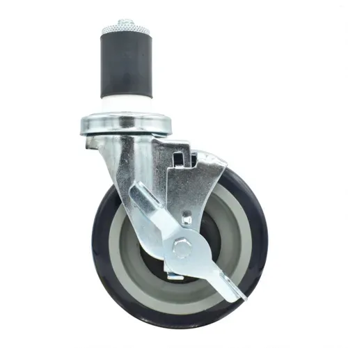 Swivel Caster, 1-1/2" expanding stem, 5" polyurethane wheel, top lock brake, 300 lb. capacity, fits 1-1/2"W OD tubing, resistant to acids and caustics, double ball bearing, operational temp range -45º to 180ºF, zinc plateQ & A