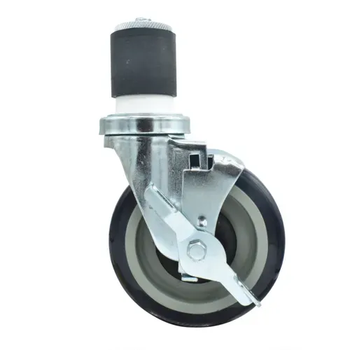 Swivel Caster, 2" expanding stem, 5" polyurethane wheel, top lock brake, 300 lb. capacity, fits 2"W OD tubing, resistant to acids and caustics, double ball bearing, operational temp range -45º to 180ºF, zinc plateQ & A