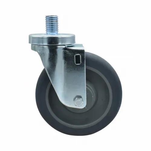 Rubber Wheel, 5" diameter, 3/4"-10 x 1" threaded stem, without brake, non-marking, 250 lb. weight capacity, operational temp range -45° to 180°F, resistant to oil, grease, water &most solvents, double ball bearing, smooth and quiet, zinc plated, gray, NSFQ & A