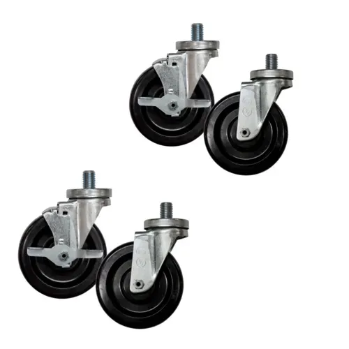 Oven Caster Kit, 5" diameter, 3/4" x 10 x 1" threaded stem, (2) without brake & (2) with top lock brake, phenolic tread, 350 lb. capacity, resistant to oil & grease, double ball bearing, smooth & quiet, operational temp range -50° to 250° F, zinc plated, NSF (4 per kit)Q & A