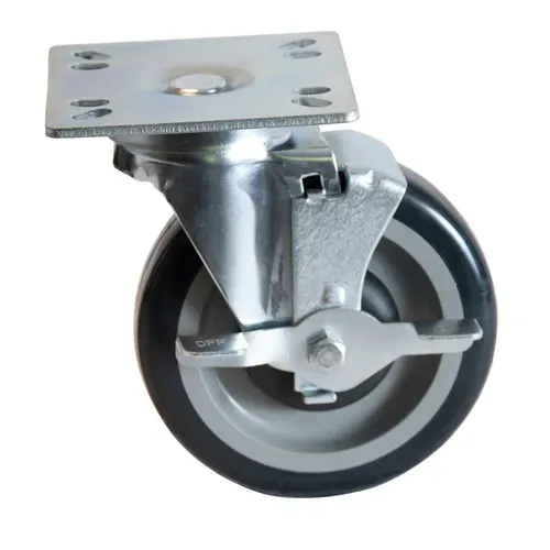 Caster, 5" diameter swivel plate, top lock brake, non-marking polyurethane tread, 300 lb. capacity, resistant to acids & caustics, 4" x 4" top plate, 1/2" king pin, double ball bearing, operational temp range -45° to 180° F, zinc plated, NSFQ & A