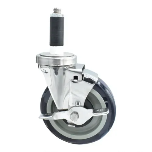 Swivel Caster, 1" expanding stem, 5" polyurethane wheel, top lock brake, 300 lb. capacity, fits 1"W OD tubing, resistant to acids and caustics, double ball bearing, operational temp range -45º to 180ºF, stainless steelQ & A