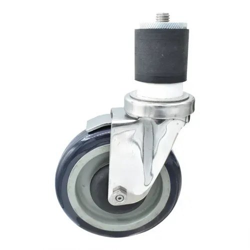 Swivel Caster, 2" expanding stem, 5" polyurethane wheel, top lock brake, 300 lb. capacity, fits 2"W OD tubing, resistant to acids and caustics, double ball bearing, operational temp range -45ºF to 180ºF, stainless steelQ & A