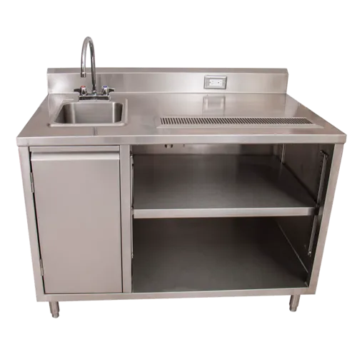 Beverage Table, 60"W x 30"D, 14" x 10" sink on left with BKF-4DM-3G-G gooseneck faucet, 14 gauge stainless steel top, 18 gauge stainless steel body, built-in 24" urn trough with drain, (1) hinged door under sink, (1) adjustable shelf, 5" riser backsplash with standard electric outlet, stainless steel legs, NSF (3-10 day lead time)Q & A