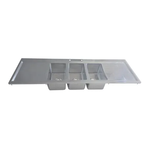 Drop-In Sink, three compartment, 70-1/8"W x 20"D x 10-5/8"H overall size, (3) 10" wide x 14" front-to-back x 10" deep compartments, 18" drainboards on left & right, marine edge, 8" OC deck mount faucet holes, includes (3) basket drains (BKDR-4), 18/304 stainless steel construction, 69-3/8" x 19-1/2" cutout required, NSFQ & A