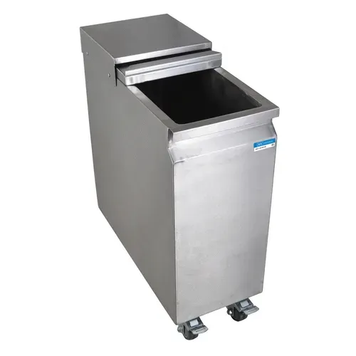 Mobile Ice Bin, with sliding lid, 11"W x 24"D x 29"H, stainless steel, 53lb. capacity, removable bottom tray, drain valve in rear of unit, 3" casters with brakeQ & A