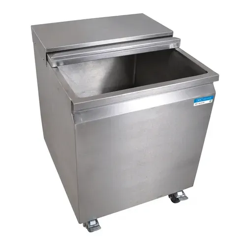 Mobile Ice Bin, with sliding lid, 22"W x 24"D x 29"H, stainless steel, 117lb. capacity, removable bottom tray, drain valve in rear of unit, 3" casters with brakeQ & A