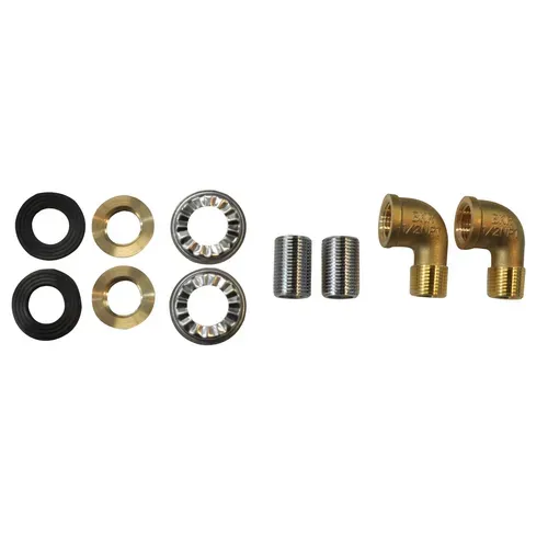 Splash Mount Faucet Mounting Kit, (2) 1/2" supply nipples, (2) retainer nuts, (2) lock washers, (2) rubber washers & (2) male & female short 90° elbows, new design, easy installationQ & A