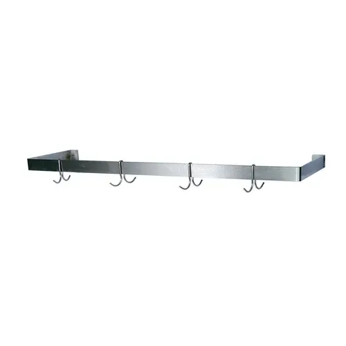Pot Rack, wall mount, single bar, 48"W x 12"D, 304 stainless steel, 2" flat bar, (4) stainless steel double prong hooks (BKSSDPH), NSFQ & A