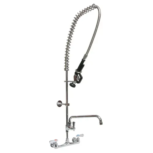 WorkForce™ Pre-Rinse Assembly, with add-on faucet, splash-mounted, 8" OC, triple ply hose, add-on faucet with 14" swing spout, 12" wall bracket, 1/4 turn ceramic valves, 1/2" female inlets, lead freeQ & A