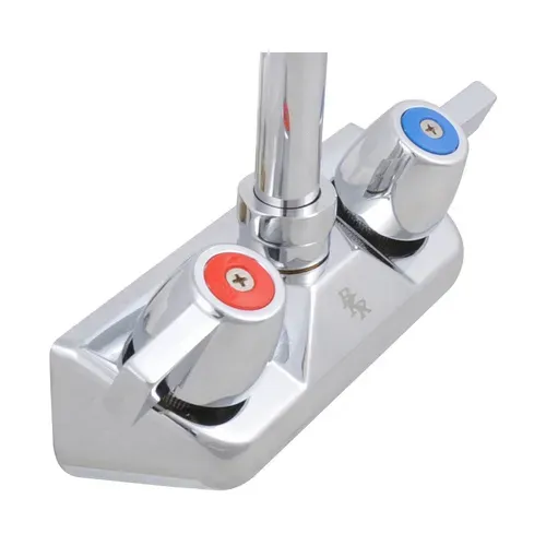 WorkForce™ Standard Duty Faucet Body, splash-mounted, 4" OC, no spout, double O-ring spout seal, 1/4 turn ceramic cartridges, polished nickel chrome finish, lead free, NSF, cCSAus (wrist blade handles not available)Q & A