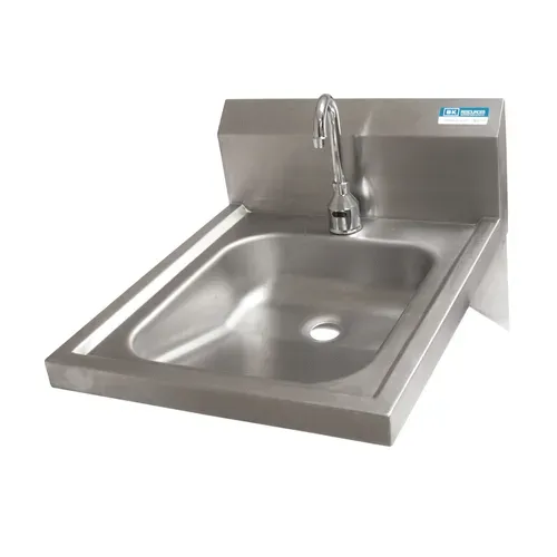 Hand Sink, wall mounted, 14"W x 16"D x 5" deep bowl, 1-7/8" drain opening, includes: BKF-DEF-3G electronic sensor faucet, 4" OC solid body deck mount faucet, 3-1/2" gooseneck spout, wrist blade handles, 8" riser, 1" turn down on rear riser, marine edge, includes wall bracket, 18/304 stainless steel, ADA compliant, NSFQ & A
