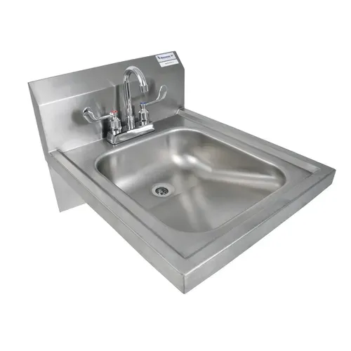 ADA Hand Sink, wall mount, 14" wide x 16" front-to-back x 5" deep bowl, 4" OC deck mount faucet with 3-1/2" gooseneck spout & wrist blade handles BKF-4DM-3G-G), 8" backsplash, marine edge, includes basket drain & wall bracket, 18/304 stainless steel, lead free, ADA CompliantQ & A