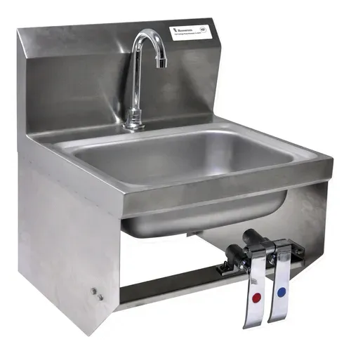 Hand Sink with Knee Valve, wall mount, 14" wide x 10" front-to-back x 5" deep bowl, deck mounted 5" gooseneck spout with knee valves, 8-1/8"H backsplash, basket drain with crumb cup, includes knee bracket & wall mounting hardware, 304 stainless steel construction, lead free, NSFQ & A