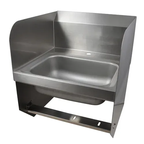 Hand Sink, wall mount, 14" wide x 10" front-to-back x 5" deep bowl, single deck mount faucet hole, side splashes on left & right, 7-3/8"H backsplash, includes: basket drain, knee & wall brackets, 304 stainless steel construction, NSF (does not include knee valve)Q & A