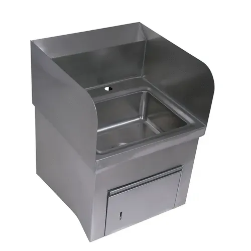 Hand Sink, wall mount, 14" wide x 10" front-to-back x 5" deep bowl, 4" OC deck mount faucet holes, integrated towel dispenser on front, side splashes on left & right, includes basket drain (BKDR-2) & wall mounting hardware, 304 stainless steel construction, NSFQ & A