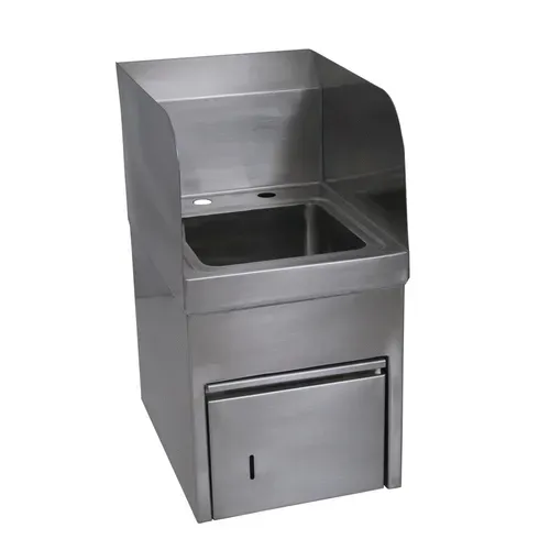 Hand Sink, wall mount, 9" wide x 9" front-to-back x 5" deep bowl, 4" OC deck mount faucet holes, integrated towel dispenser on front, side splashes on left & right, 8"H backsplash, includes basket drain (BKDR-2) & wall mounting hardware, 304 stainless steel construction, NSFQ & A