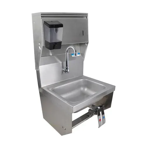 Hand Sink, wall mount, 14" wide x 10" front-to-back x 5" deep bowl, single splash mount faucet hole, includes dual-pedal knee valve kit (BKKSVSGS), 3-1/2" gooseneck spout (BKF-WMB), integral towel dispenser & soap dispenser (BK-SD), 3-1/2" basket drain with crumb cup, wall mounting hardware, 304 stainless steel construction, NSFQ & A