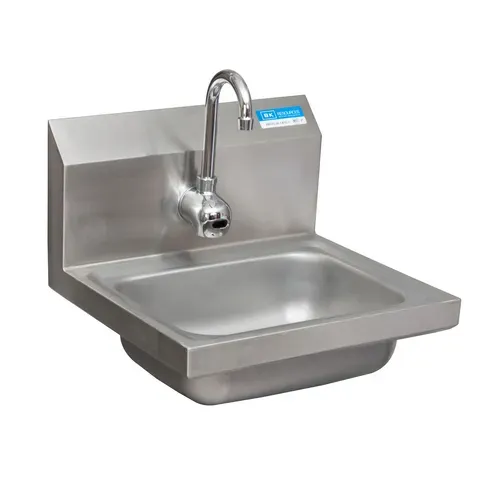 Hand Sink, wall mount, 14" wide x 10" front-to-back x 5" deep bowl, single splash mount faucet hole with (1) BKF-SEF-3G sensor faucet, 1-7/8" basket drain with crumb cup, wall bracket included, 304 stainless steel, NSFQ & A