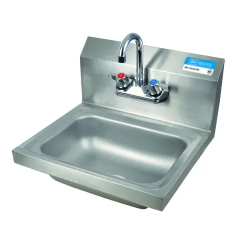 Hand Sink, wall mount, 14" wide x 10" front-to-back x 5" deep bowl, 4" OC splash mount faucet (BKF-W-3G-G, lead free), marine edge, 8-1/8" backsplash, includes 1-7/8" basket drain with crumb cup & wall mounting hardware, 304 stainless steel construction, NSFQ & A