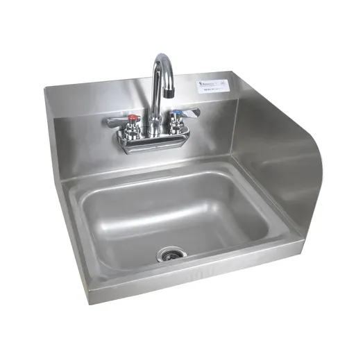 Hand Sink, wall mount, 14" wide x 10" front-to-back x 5" deep bowl, 4" O.C splash mount faucet (BKF-W-3G-G, lead free), marine edge, side splash on right, includes basket drain & wall mounting hardware, 304 stainless steel construction, NSFQ & A
