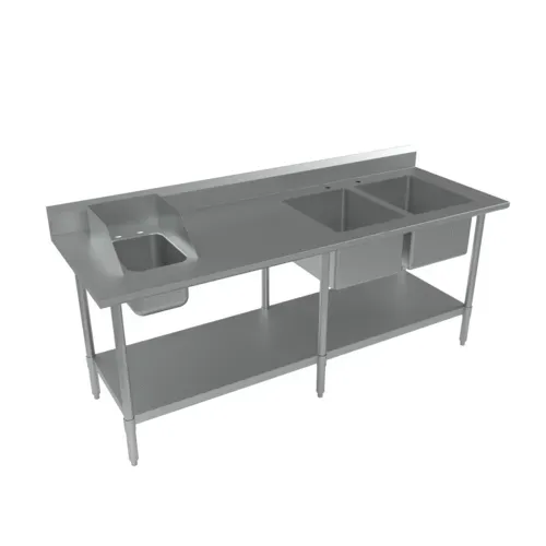 Work Table with prep Sink, sinks on right, 84"W x 30"D, (2) 16" wide x 20" front-to-back x 10" deep sink bowls with 8" O.C. deck mount faucet holes, (1) 14"W x 10"D handsink, with 4" O.C. deck mount faucet holes, 16/304 stainless steel construction, NSF (3-10 Day Lead Time)Q & A
