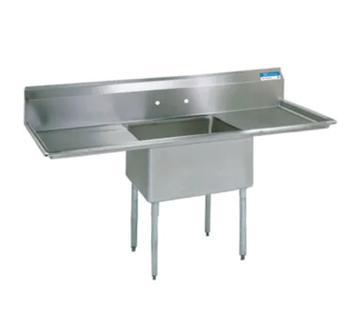 Sink, one compartment, 52"W x 25-13/16"D x 43-3/4"H overall size, 16" wide x 20" front-to-back x 12" deep compartment, (2) left & right 18" drainboards, 9"H backsplash, 8" OC splash mount faucet holes, 1-1/2" rolled edges on front & sides, includes basket drain (BKDR-4), 18/304 stainless steel construction, galvanized steel legs, adjustable high impact corrosion resistant feet, NSFQ & A