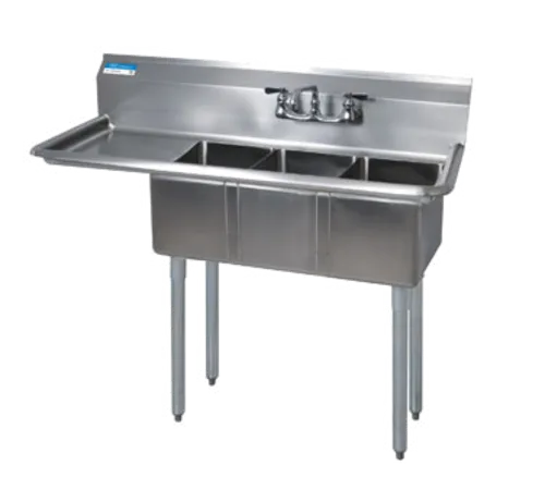 Convenience Store Sink, three compartment, 47-1/2"W x 19-13/16"D x 39-3/4"H overall size, 10" wide x 14" front-to-back x 10" deep compartments, 15" drainboard on left, 9"H backsplash, 8" OC splash mount faucet holes, 1-1/2" rolled edges on front & sides, includes basket drains, 18/304 stainless steel deck & bowl, galvanized steel legs, adjustable high impact corrosion resistant feet, NSFQ & A